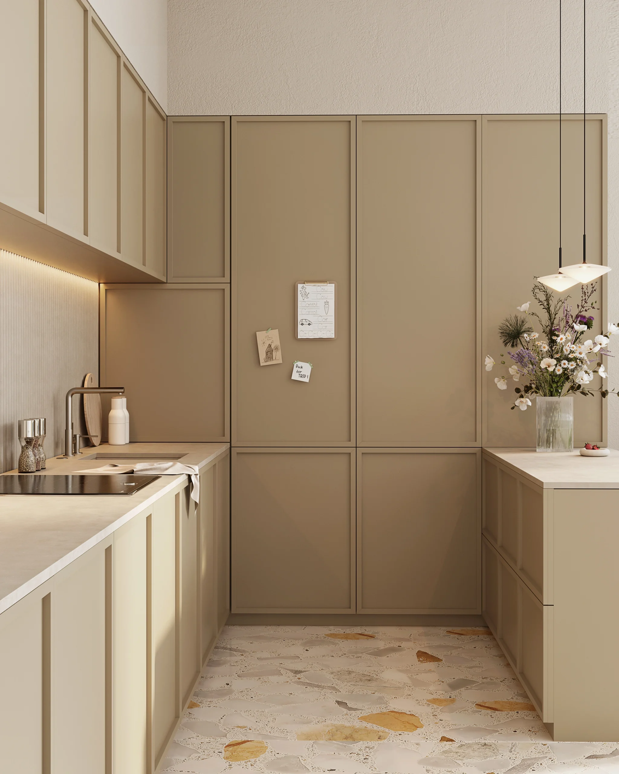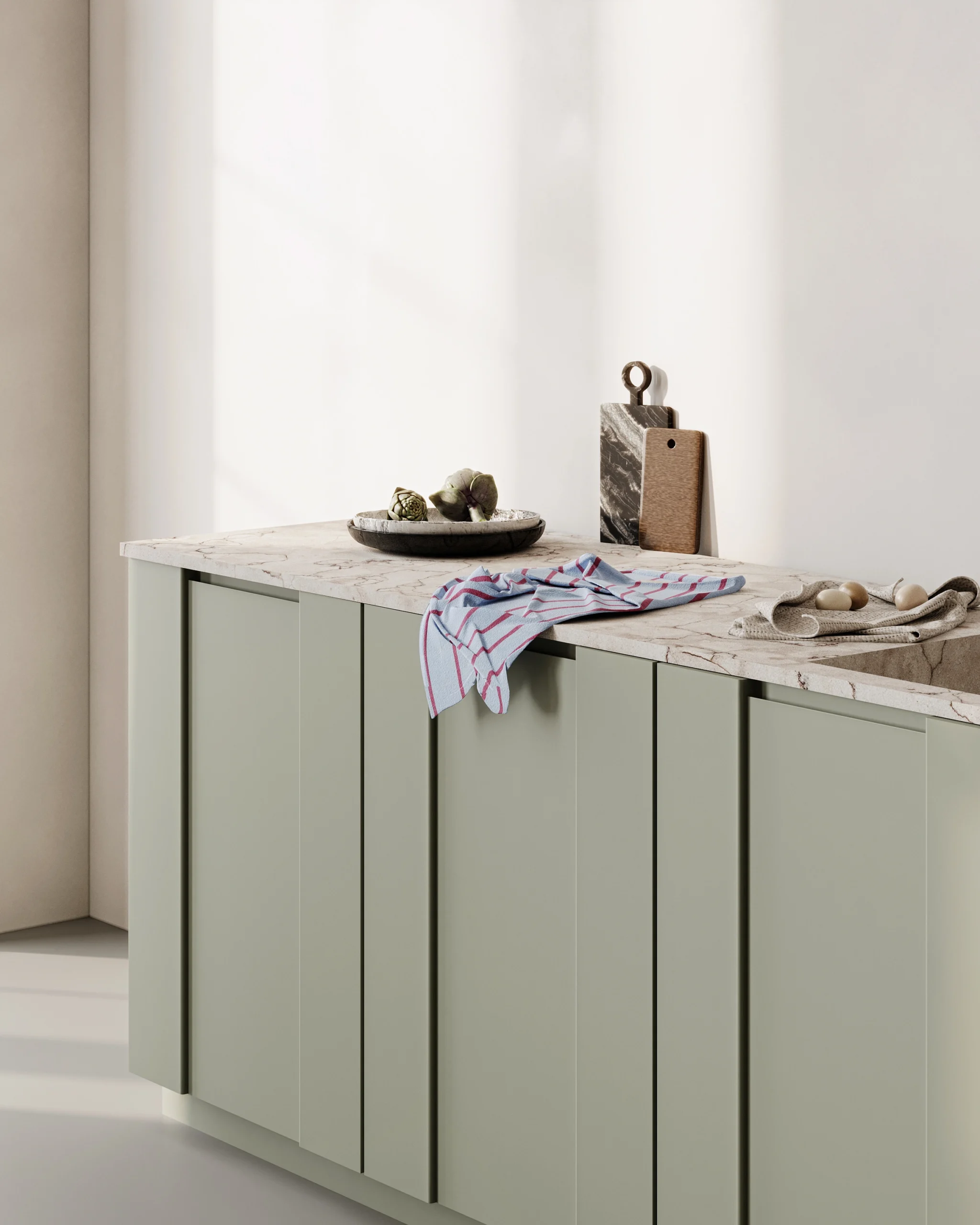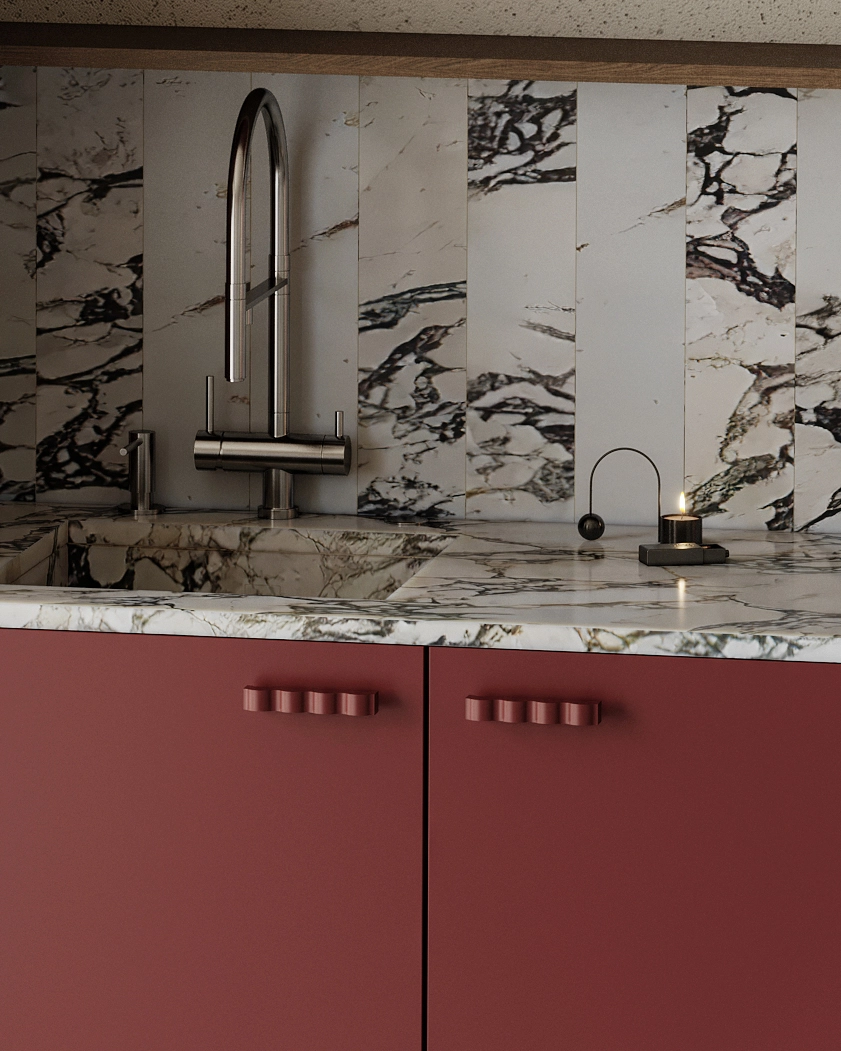 Ručke su oblikovane kao talasasti motiv i nalaze se direktno na frontovima — vizuelno mekane, a ergonomski prijatne za upotrebu. Na gornjim elementima ovaj detalj postaje suptilna linija urezana pri dnu fronta, koja osim estetske uloge ima i funkcionalnu: omogućava lako otvaranje bez dodatnih mehanizama. Talas u dizajnu prati ritam svakodnevice, ali unosi osećaj lakoće i poznatosti. Ova kuhinja je stvorena za one koje vole da zadrže tradiciju — ali na svoj, savremen način. Za nežna jutra, porodične recepte i prostor koji se ne dokazuje — već pripada.